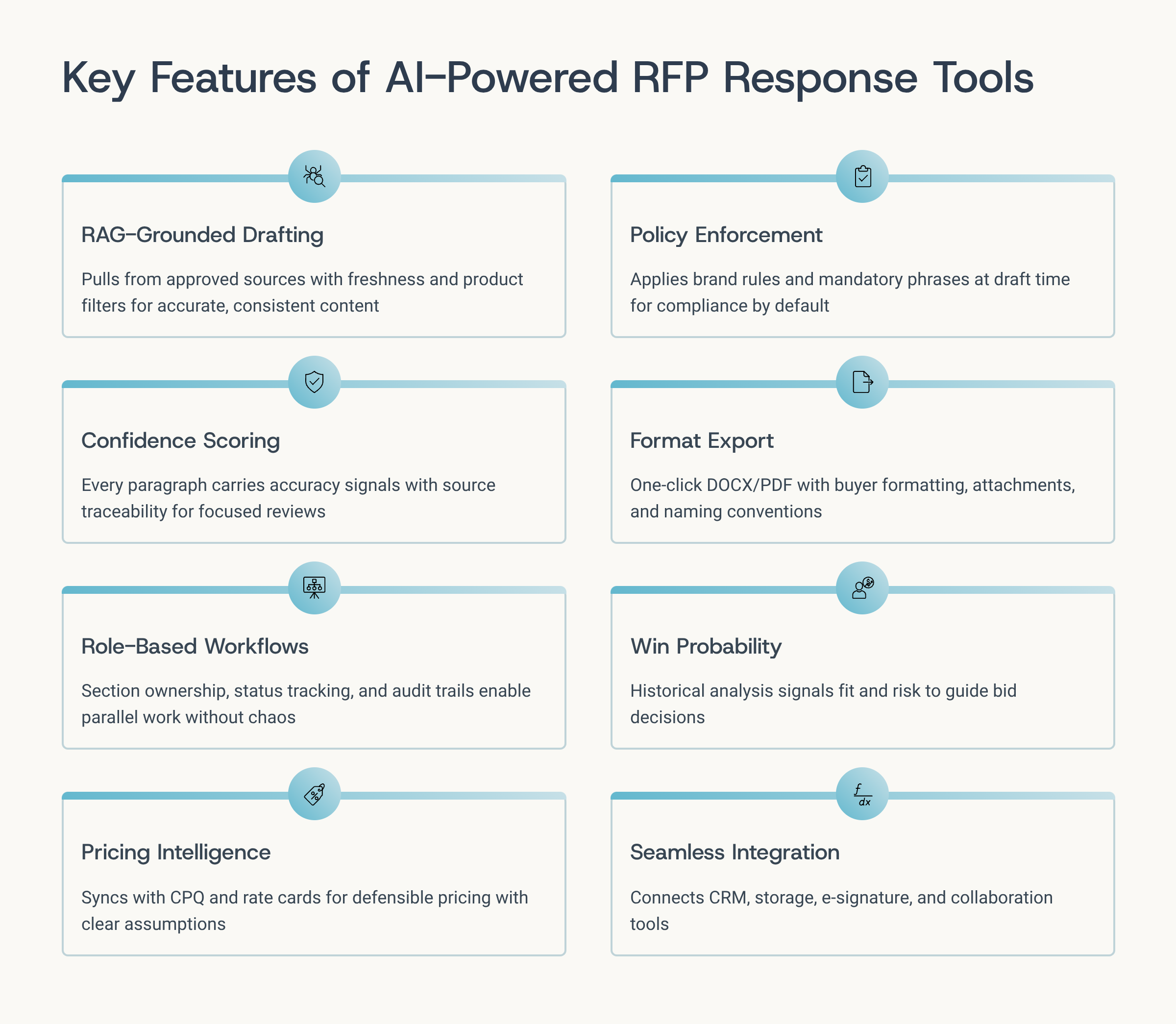 When you evaluate “AI for RFP responses,” don’t just look for a smart writer. You need a governed system that reads, reasons, drafts, proves, and packages—end to end. Here are the must-have capabilities, plus the practical “so what?” for each.