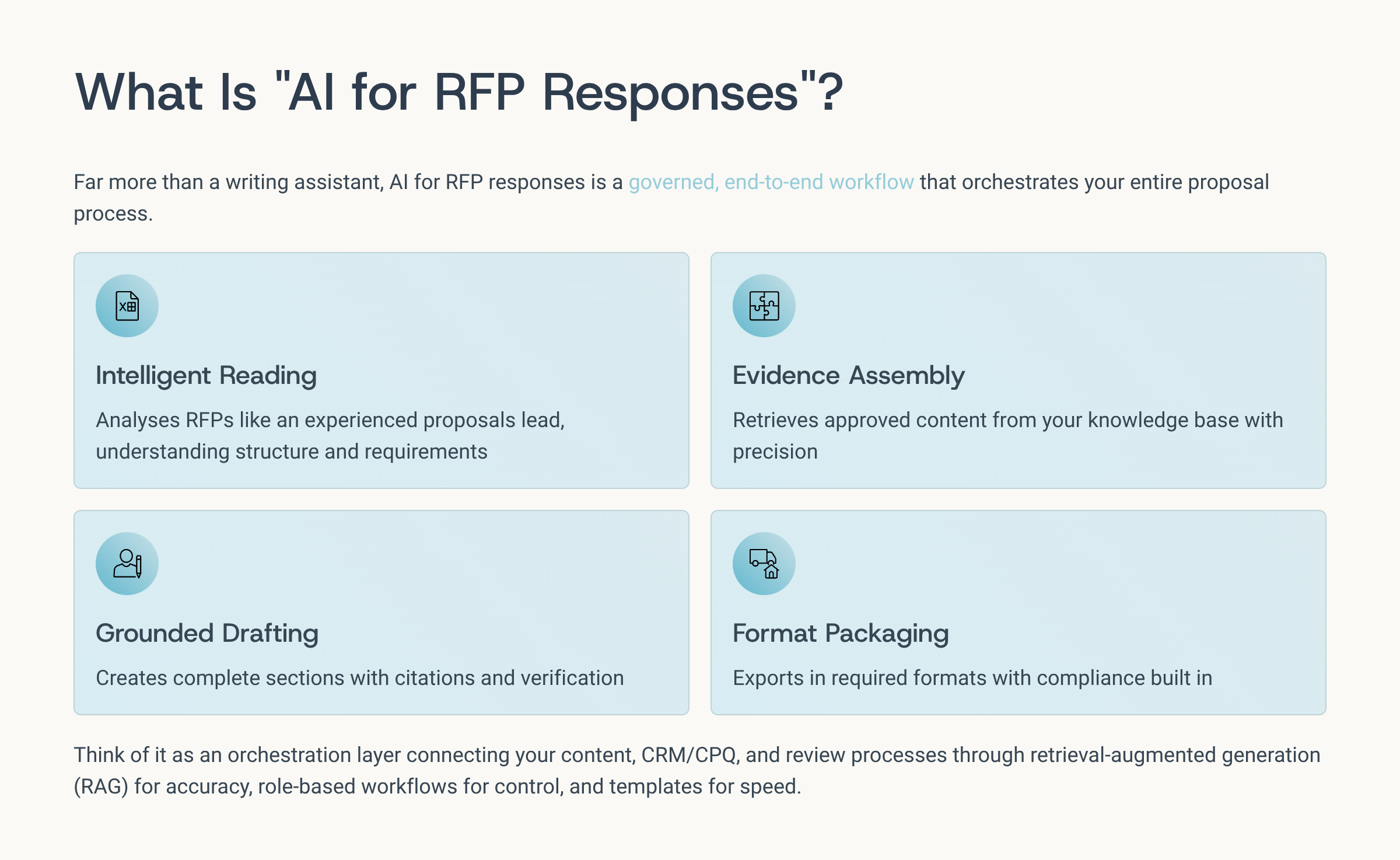 “AI for RFP responses” is not just a writing bot but a governed, end-to-end workflow that reads the RFP like a seasoned proposals lead, assembles the right evidence, drafts every section with citations, and packages the response in your required format. Think of it as an orchestration layer on top of your content, CRM/CPQ, and review process: retrieval-augmented generation (RAG) for accuracy, role-based workflows for control, and export templates for speed. Here’s how each stage works in practice: