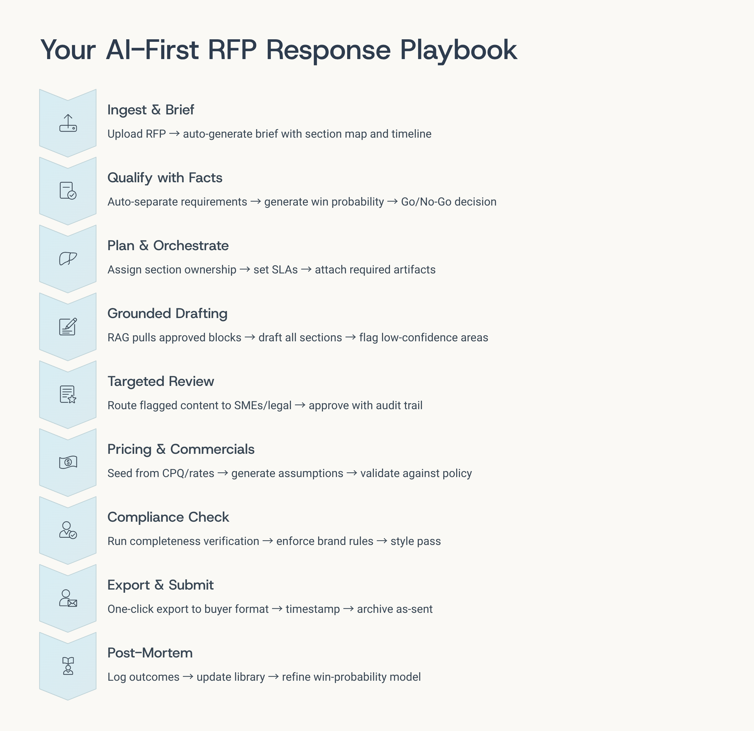This playbook turns AI into a system of action—decide fast, draft grounded, review with precision, and submit clean—while compounding knowledge so every RFP after this one is easier.
