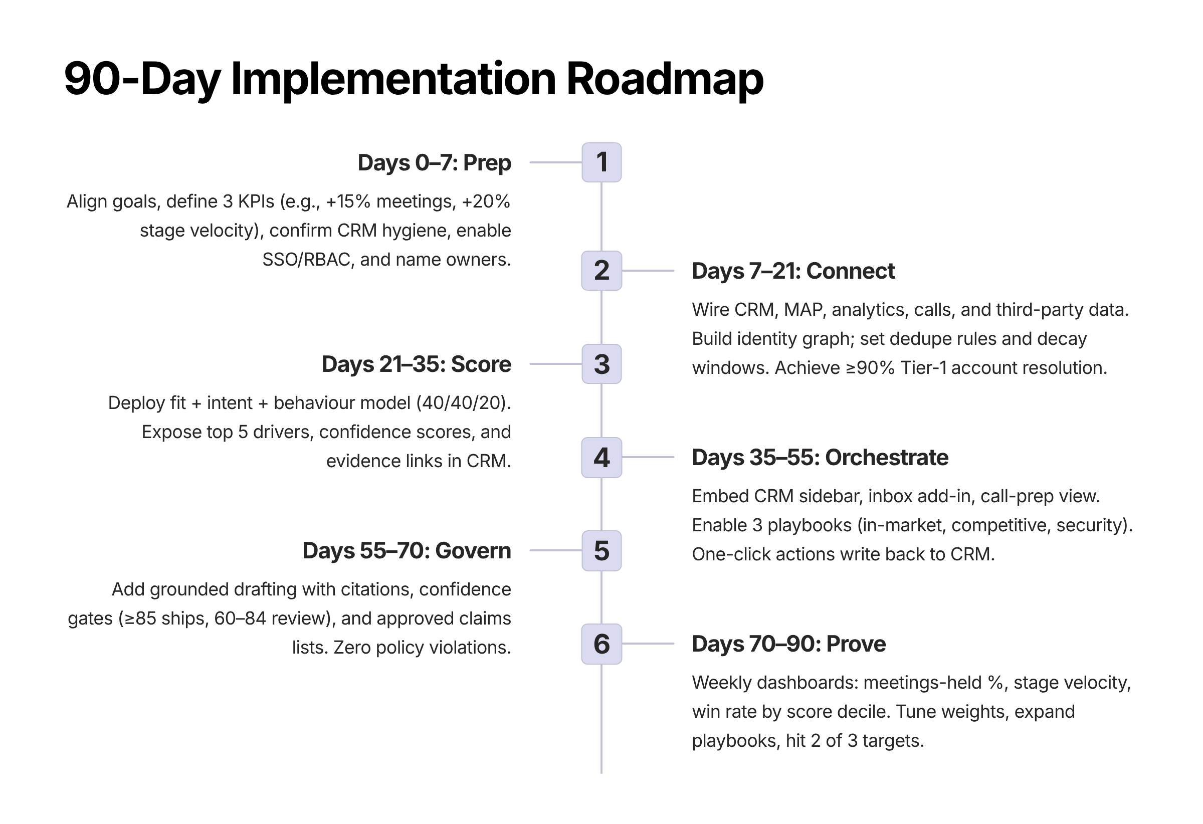 - Dashboard: meetings-held %, time-in-stage, win rate (AI-sourced vs baseline).