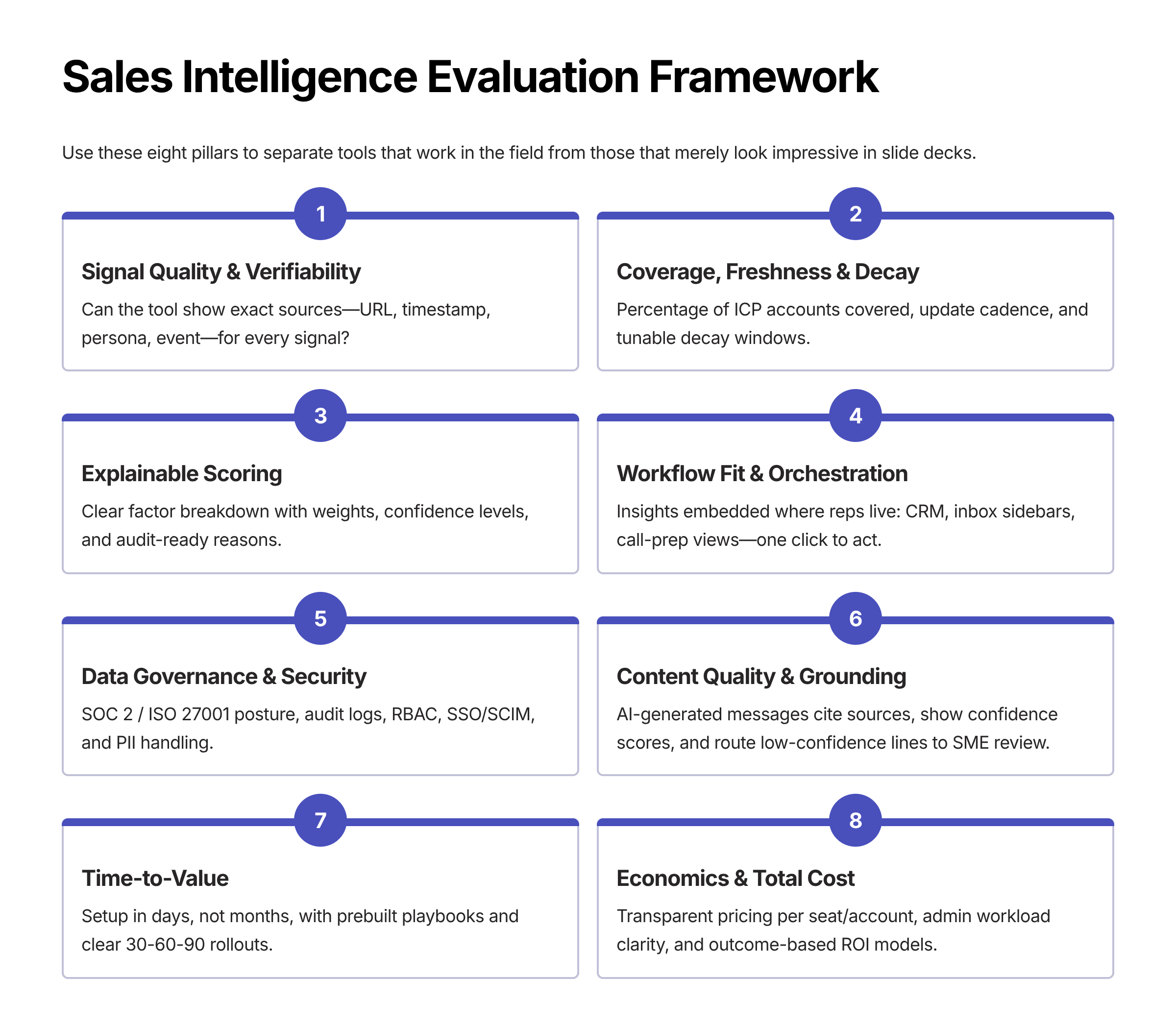 Here is a quick evaluation framework for sales intelligence that you could use to cut the hype and focus on your requirements: