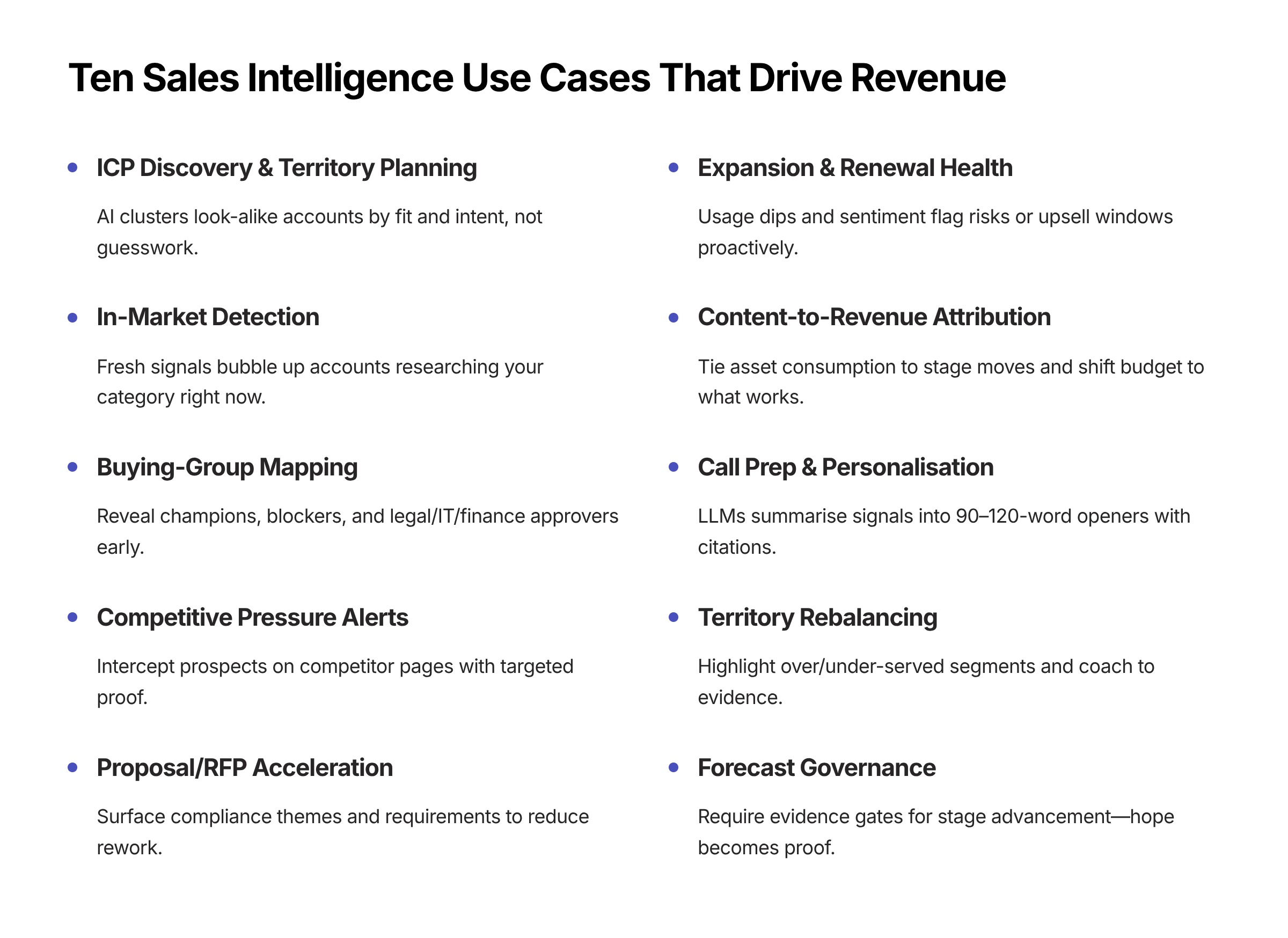 - In-market surge (7-day) → BDR one-to-few email + proof asset.