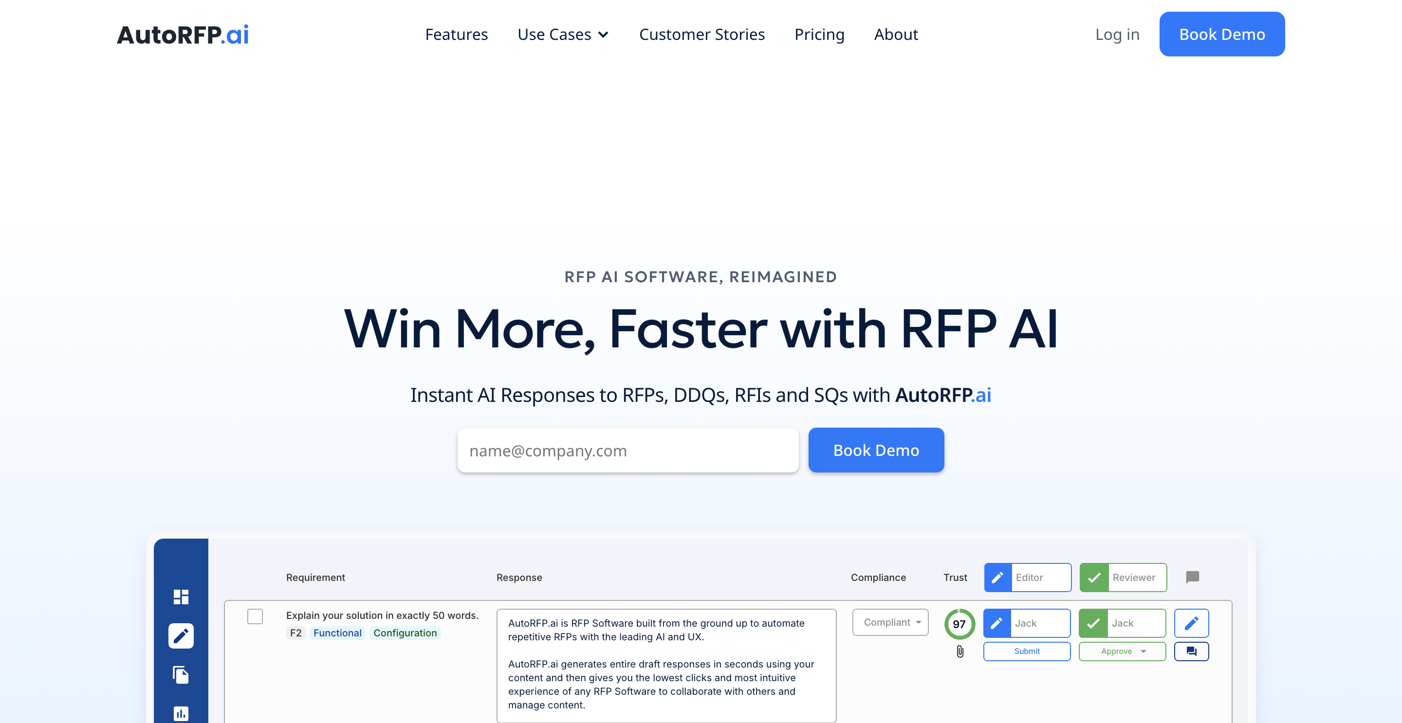 - Rapid AI-generated answers: Drafts responses to RFP questions within minutes of uploading the RFP document, significantly accelerating the response process.