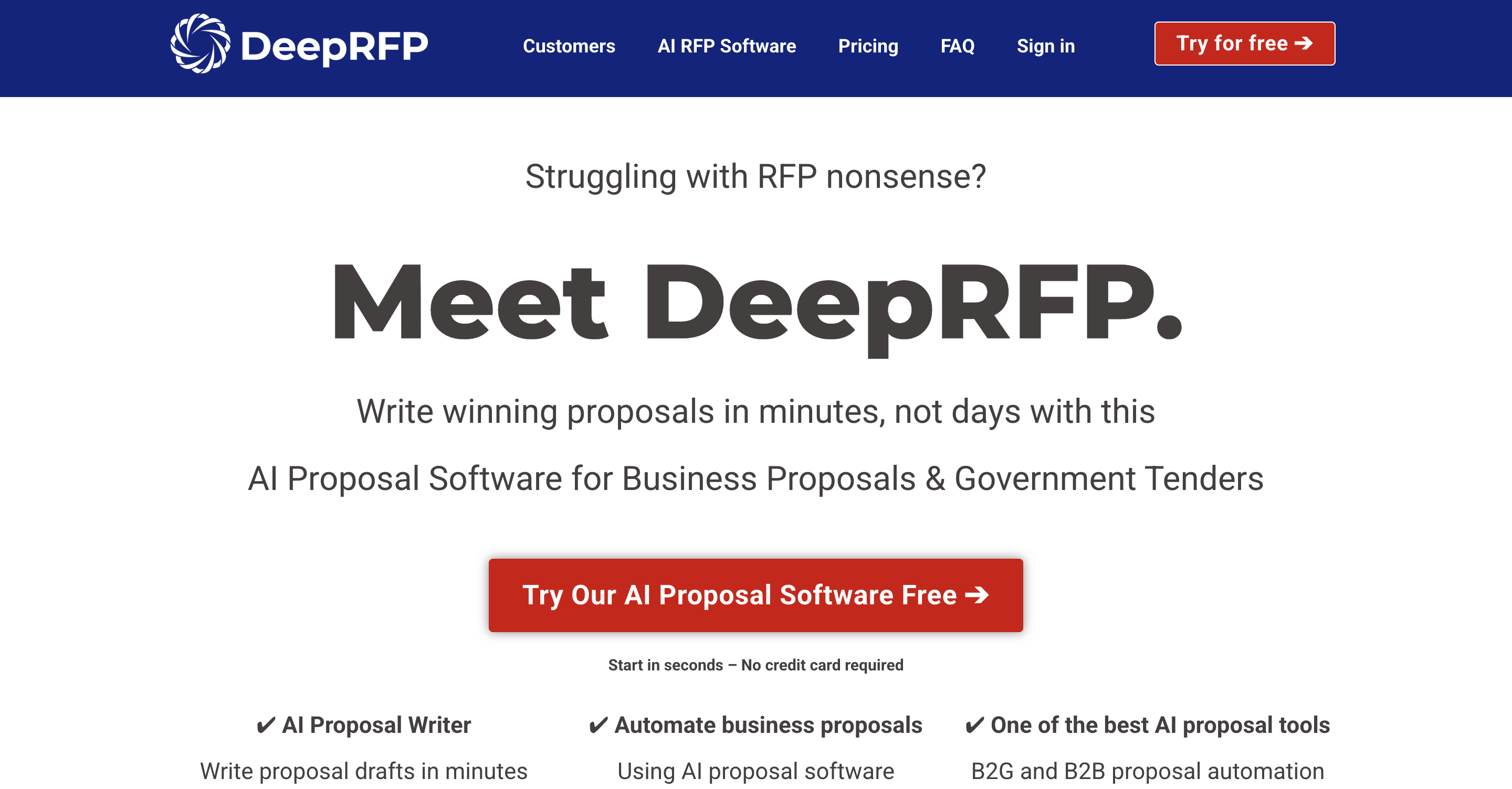 DeepRFP is an AI-powered proposal writing and RFP automation tool that acts like a virtual proposal assistant. It can generate first draft responses in seconds and also analyze RFP documents for risks or requirements. The platform provides “virtual SME” (Subject Matter Expert) AI agents that craft company-specific answers, functioning as on-demand proposal writers and editors. An AI RFP Analyzer is included to break down complex RFPs – flagging red flags, identifying compliance requirements, and creating matrices so teams can quickly assess what’s needed.