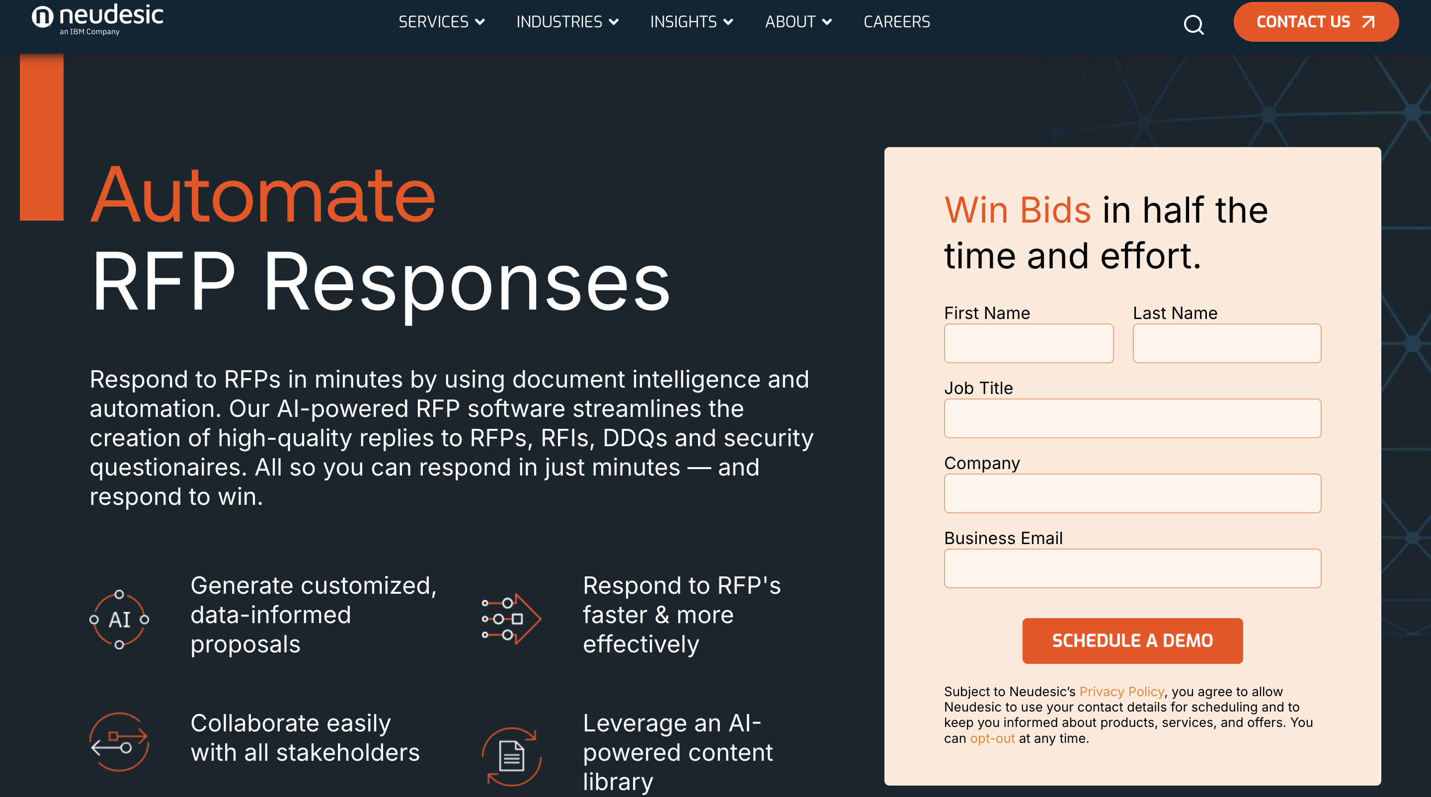 Neudesic’s AI-Powered RFP Response Automation is an enterprise-level solution that uses advanced AI and document intelligence to not only craft RFP responses but also help teams prioritize which opportunities to pursue. At its core is an intelligent content library that surfaces an organization’s most relevant, proven answers for each proposal. What sets Neudesic apart is its emphasis on analytics and smart triage: it leverages technologies like Azure OpenAI and Microsoft’s Semantic Kernel to scan incoming RFPs, rank them by potential value/fit, and even suggest where to focus effort for the highest win probability. This means your team can work smarter by concentrating on bids that matter most, armed with data-driven insights.
