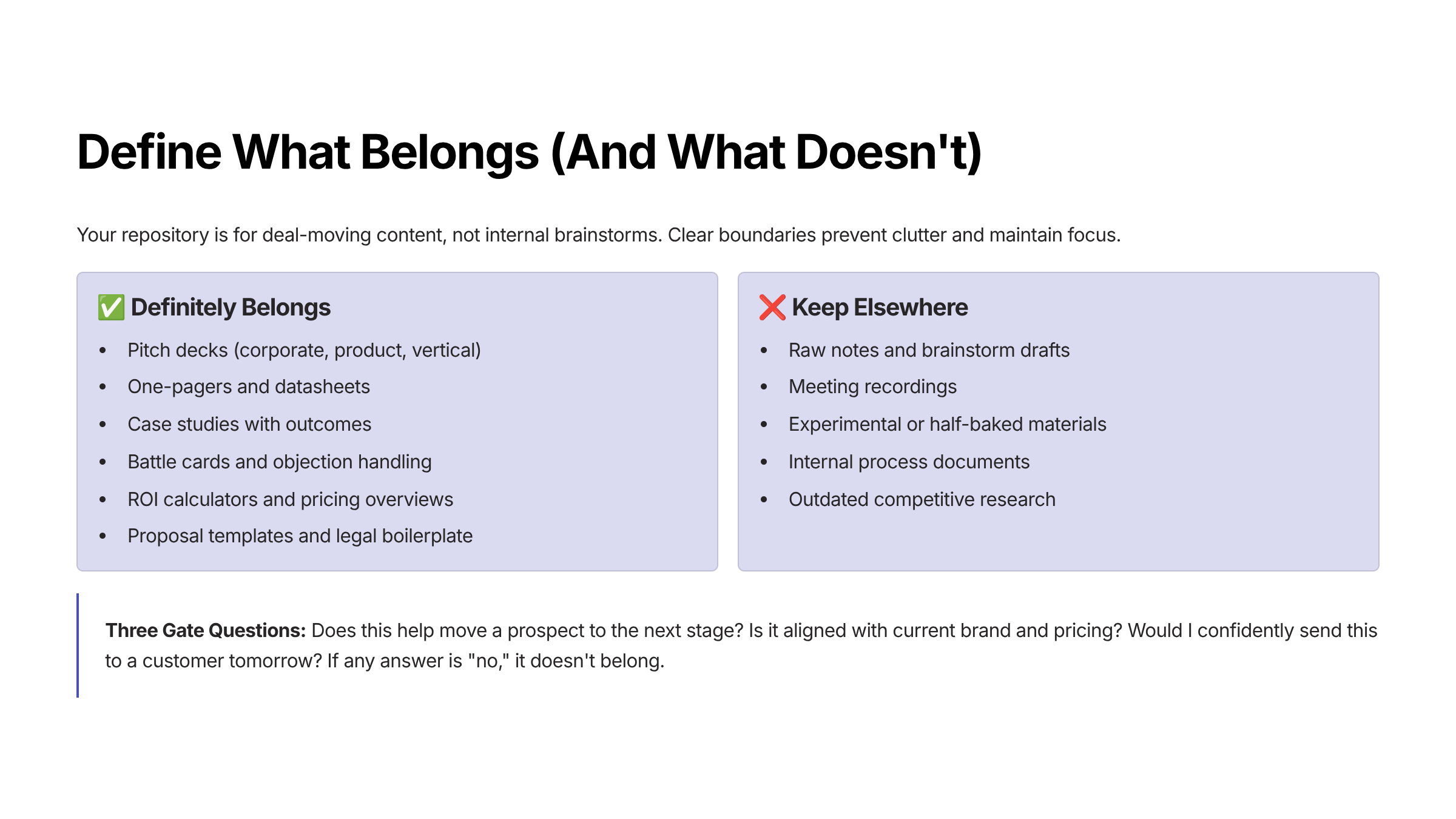 Before you “build,” you clean. Pull everything into one temporary staging folder: decks, PDFs, proposals, case studies, datasheets, ROI calcs, pricing sheets, demo scripts, battle cards, competitive notes, legal boilerplates—everything.
