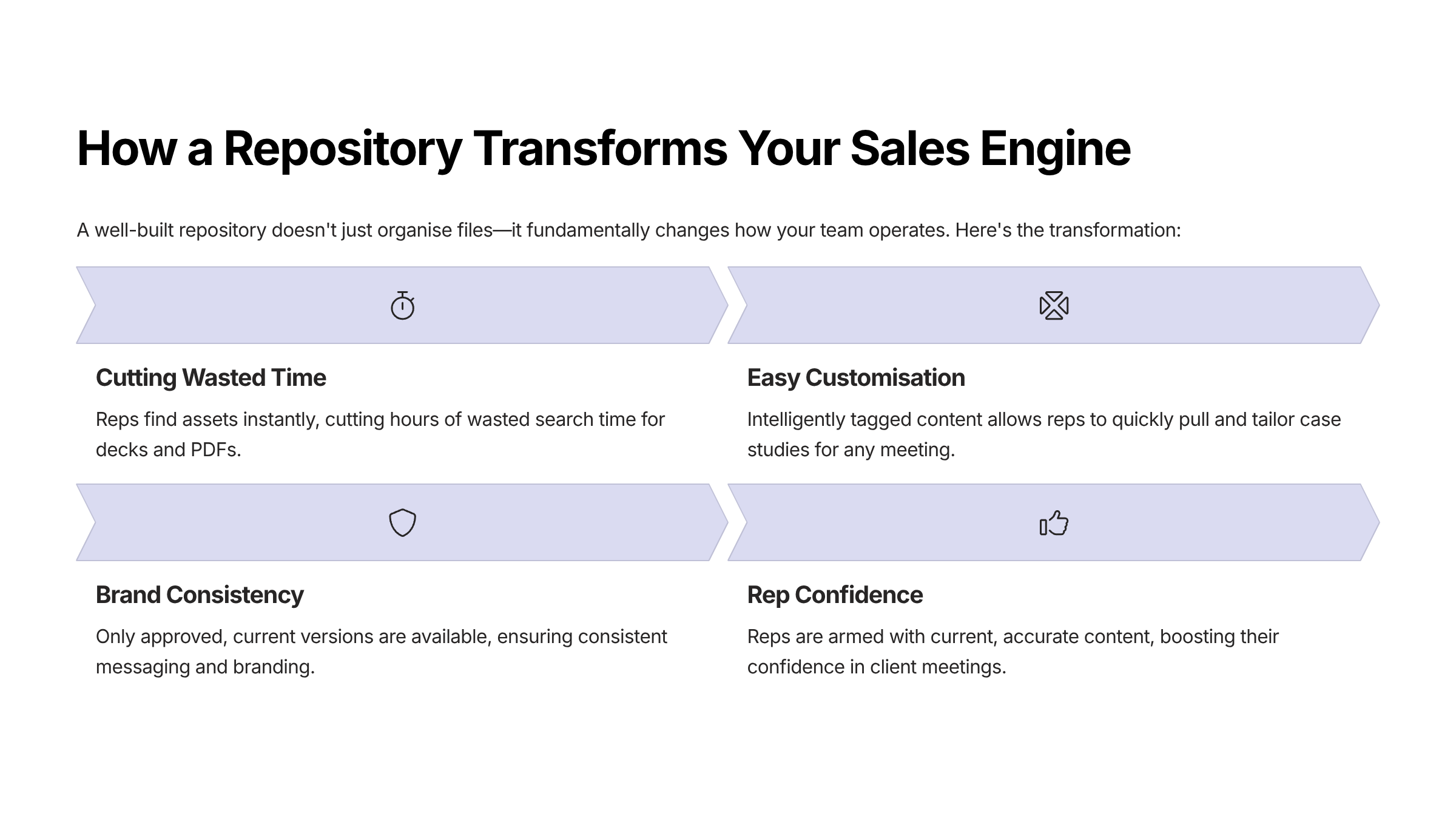 Without a repository, sales teams live in a state of constant scramble: chasing files, reinventing content, and second-guessing their materials. With one, they shift to showing up ready—walking into meetings confident, aligned, and focused on the buyer instead of the back office.