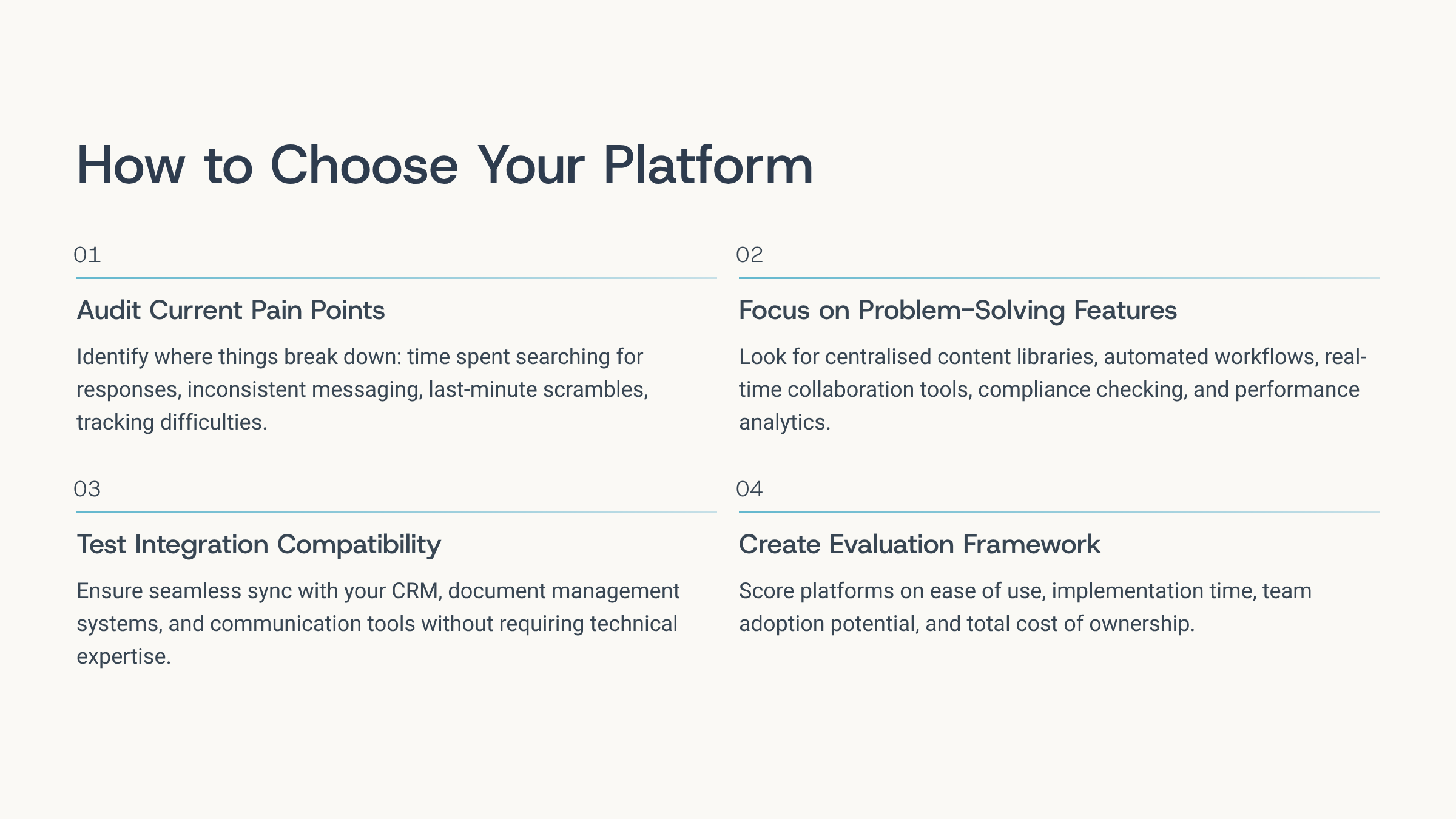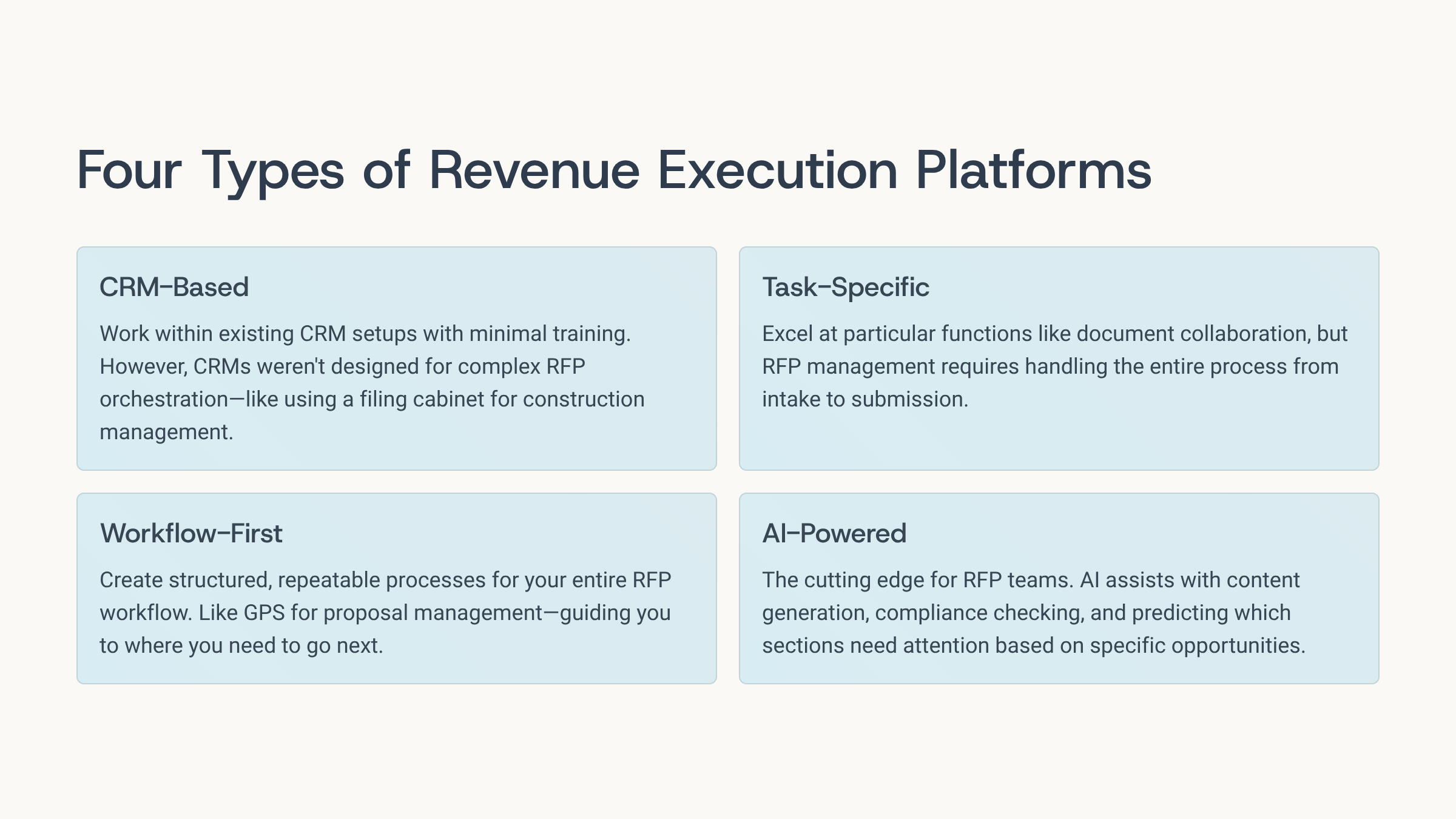 The CRM-based platforms will work within your existing CRM setup. Your team won't need extensive training, which is great. The downside? CRMs were designed to store customer data, not orchestrate complex RFP processes. It's like using a filing cabinet to manage a construction project - technically possible, but missing some important tools.