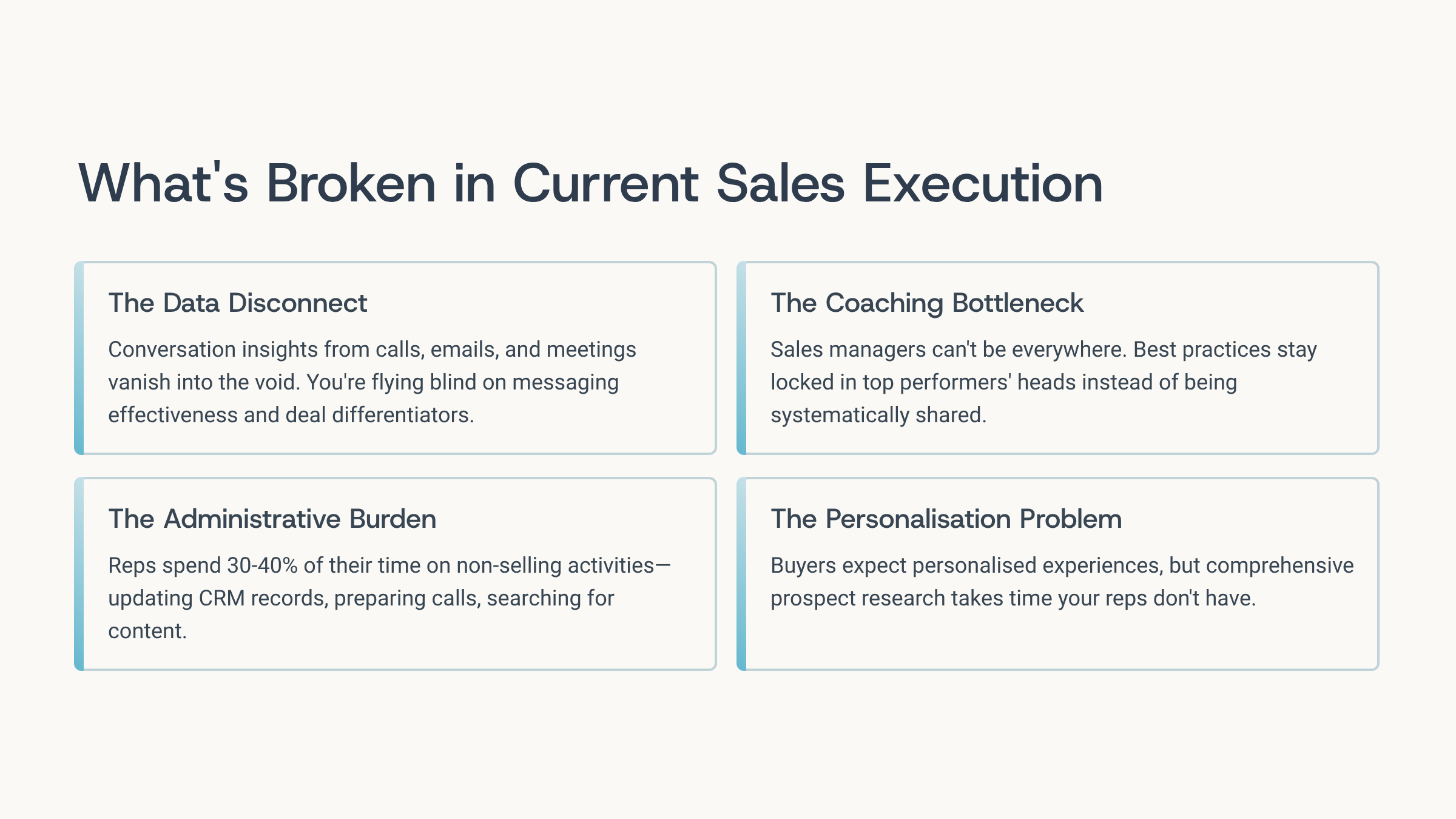 More than being minor inefficiencies, these become systematic problems that compound into missed quotas, frustrated reps, and lost revenue opportunities.