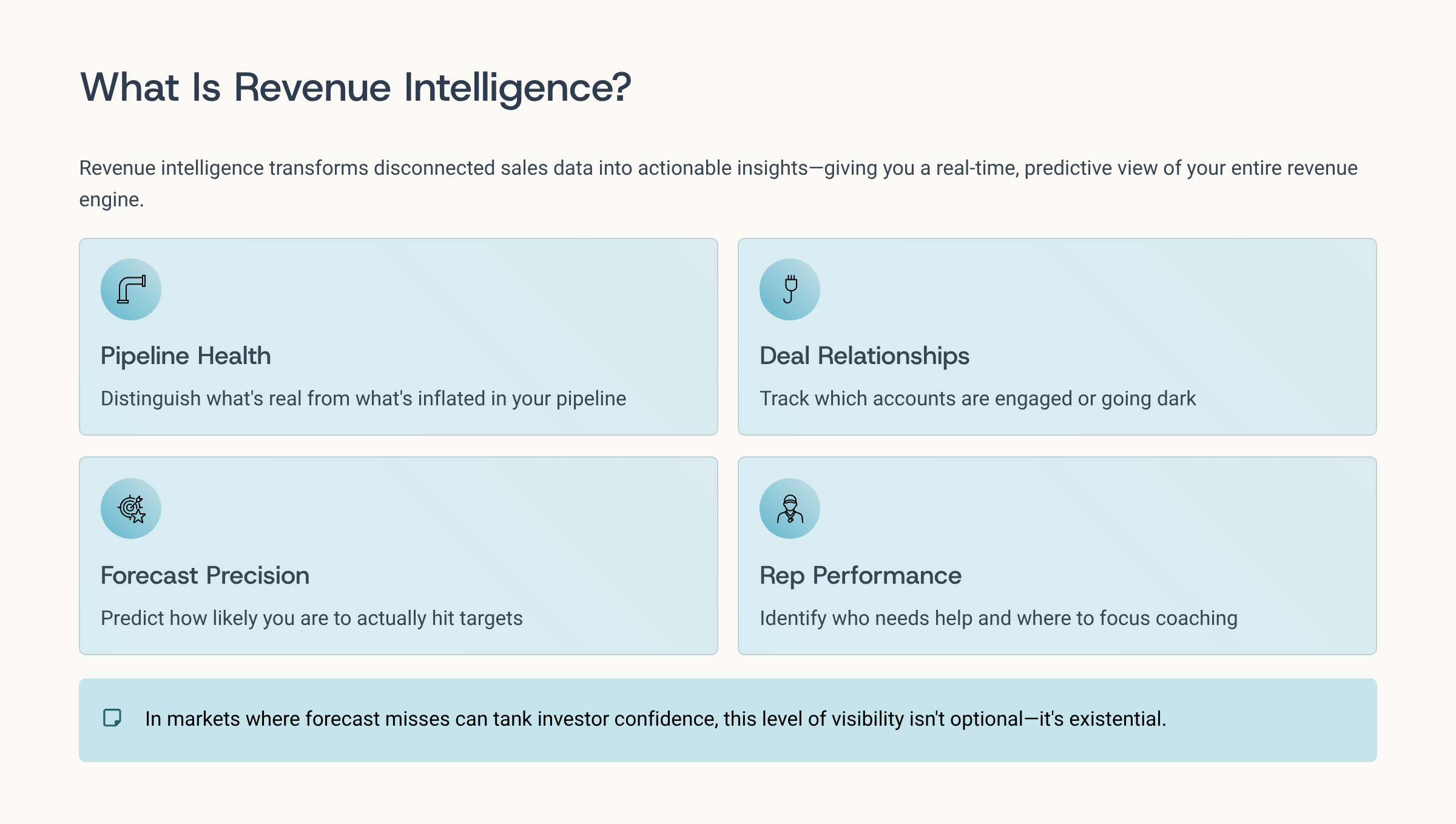 Revenue intelligence isn’t a “better dashboard.” It’s a living ecosystem of insights that combines data, context, and AI to tell you: