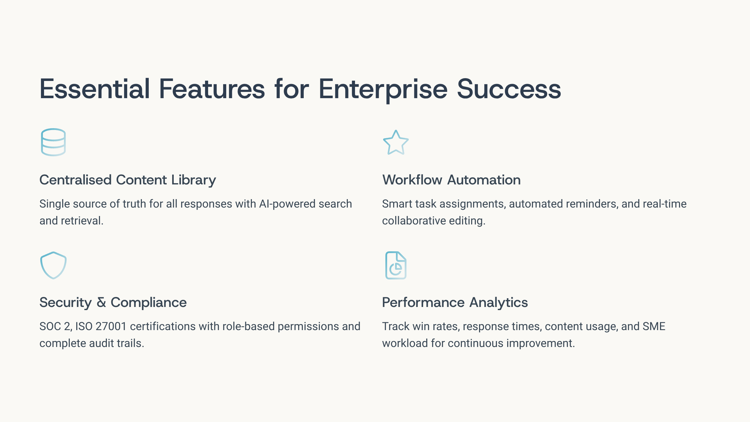 - Analytics & Continuous Improvement Dashboards track bottlenecks, win rates, and content freshness for future responses.