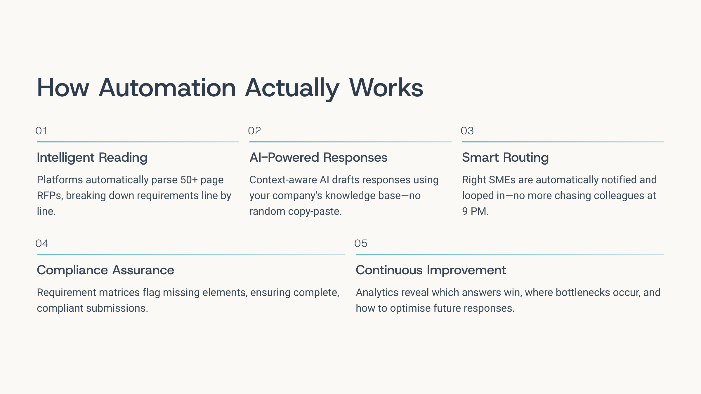 If you’ve ever spent hours digging through old proposals for that one perfect compliance answer, or sat in a “war room” trying to assign 300 questions across sales, legal, and security… Automation is basically the fix for that chaos.