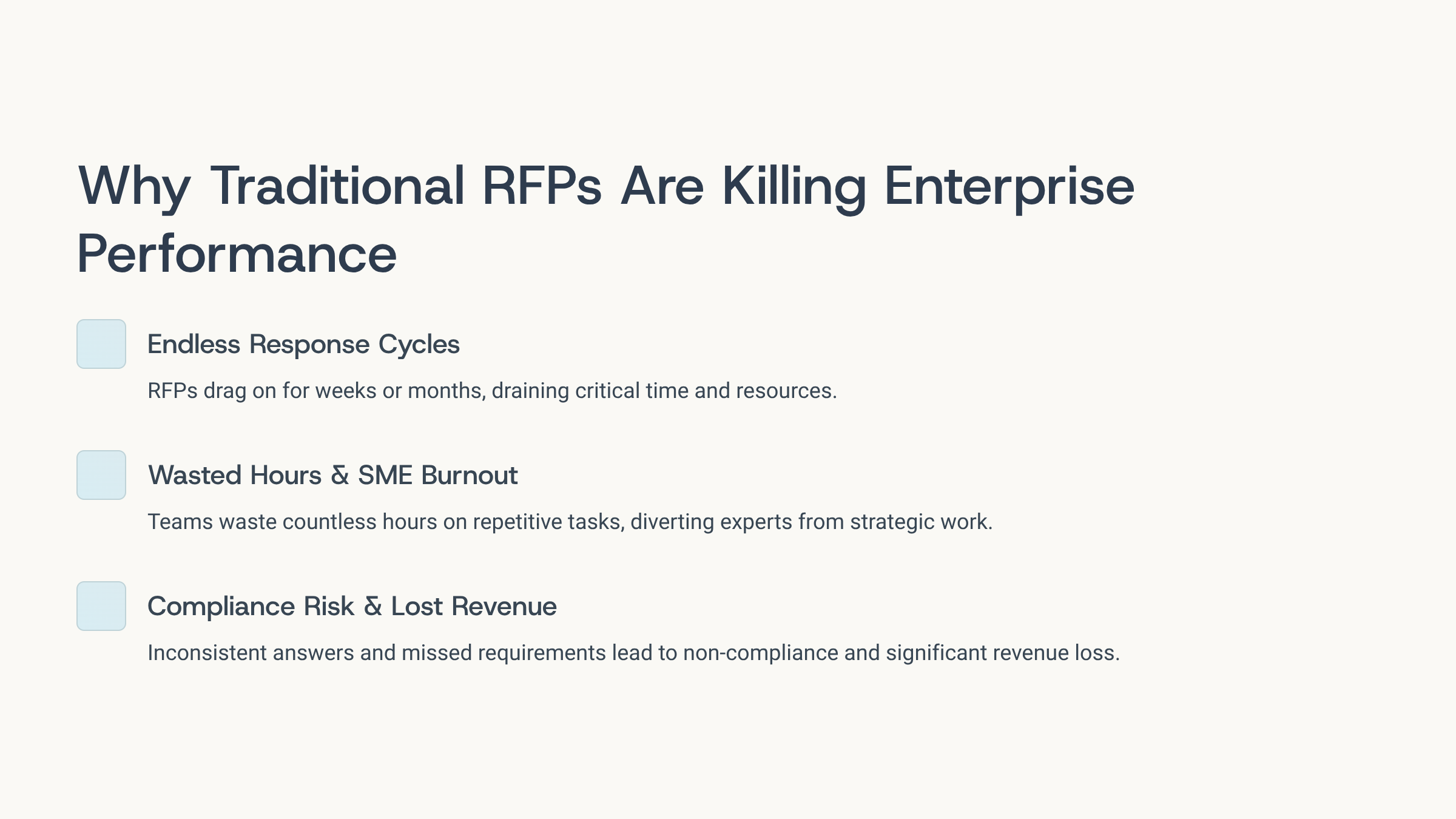 - Long Response Cycles Manual processes average 6–10 days per RFP. For global enterprises or public sector bids, timelines can stretch into months.