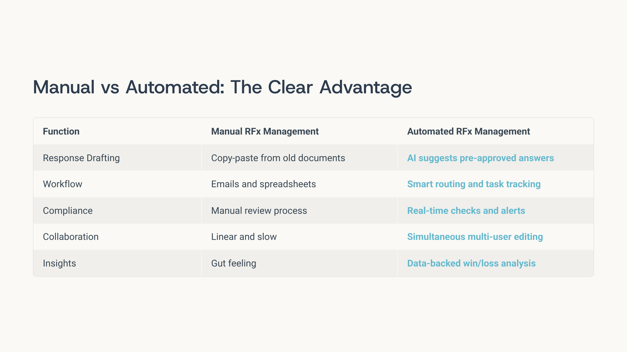 Response Drafting | Copy-paste from old docs | AI suggests pre-approved answers |