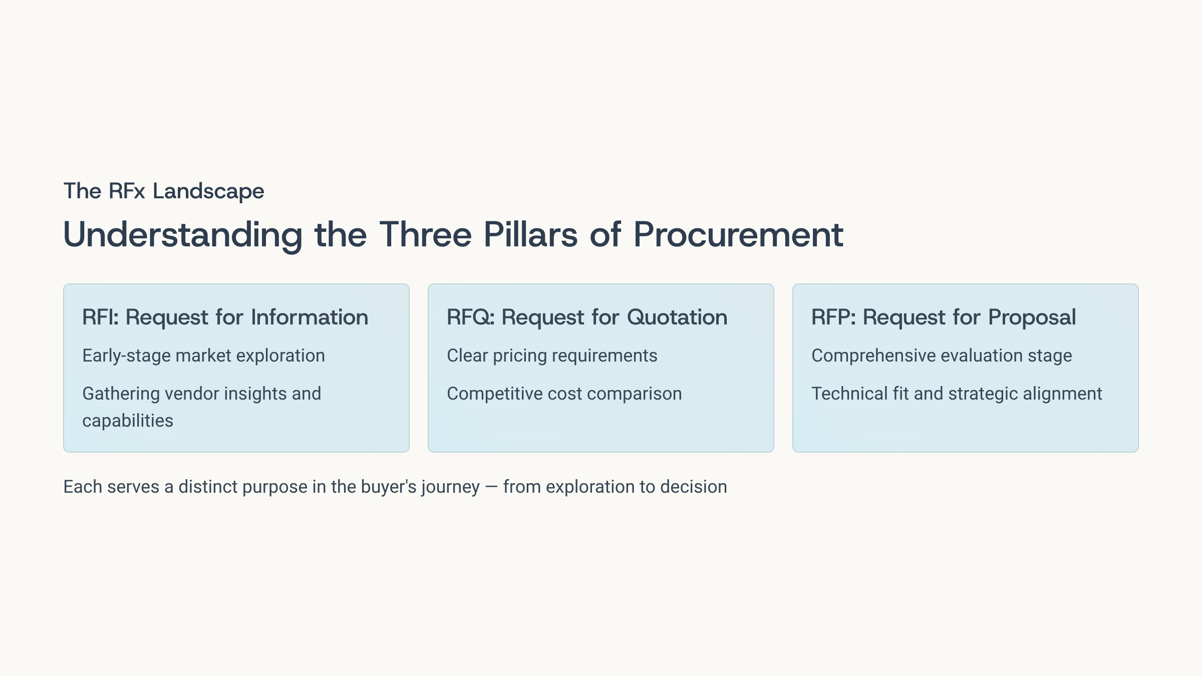 RFx Response Management is the structured, tech-enabled process of organizing, standardizing, and optimizing how organizations respond to RFIs, RFQs, and RFPs.