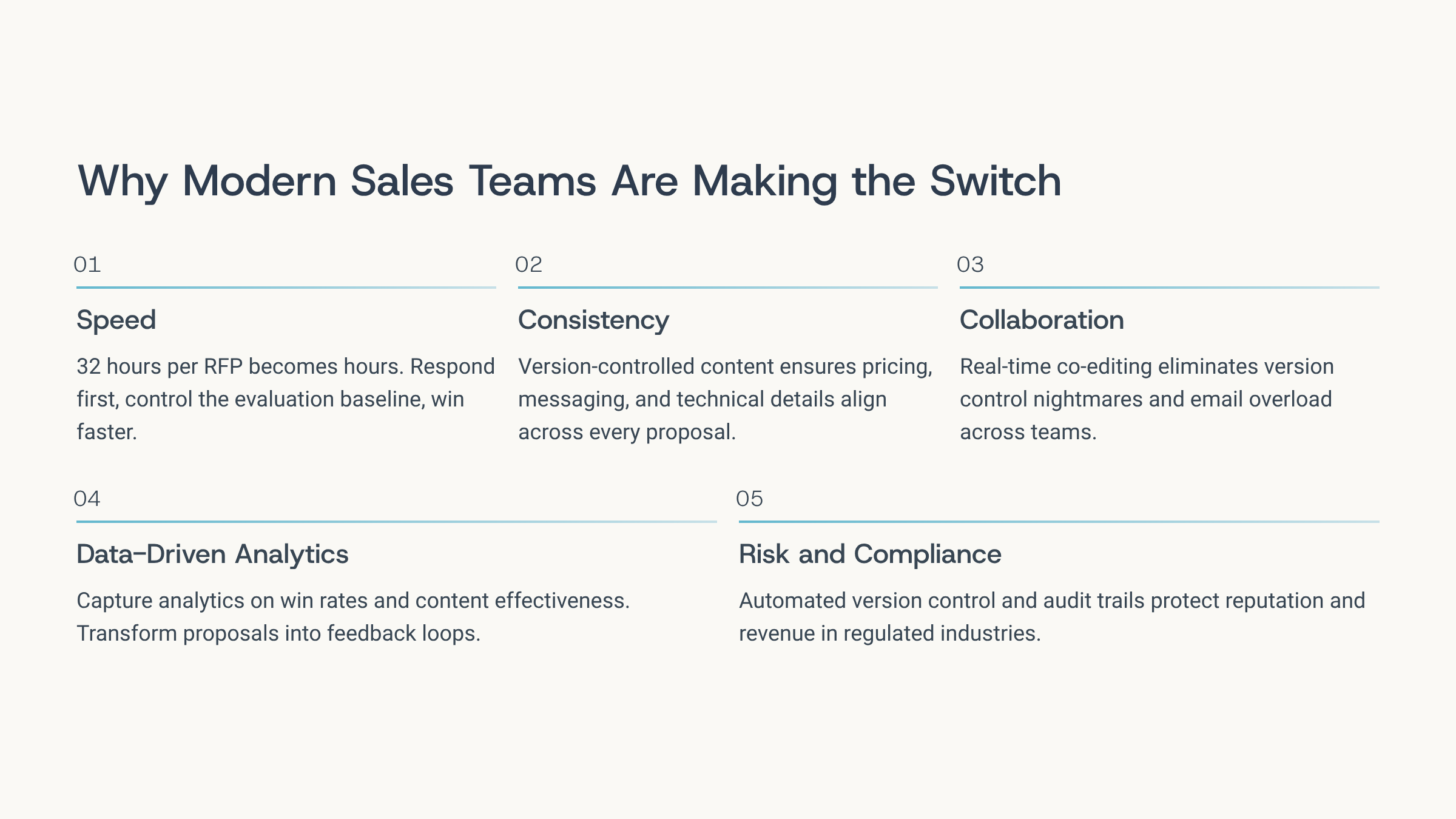 Instead of juggling shared drives, spreadsheets, and frantic email threads, teams use centralized platforms that handle response drafting and version control, automated content recommendations, approval workflows, collaboration between sales, product, and compliance teams, and analytics for win/loss insights.