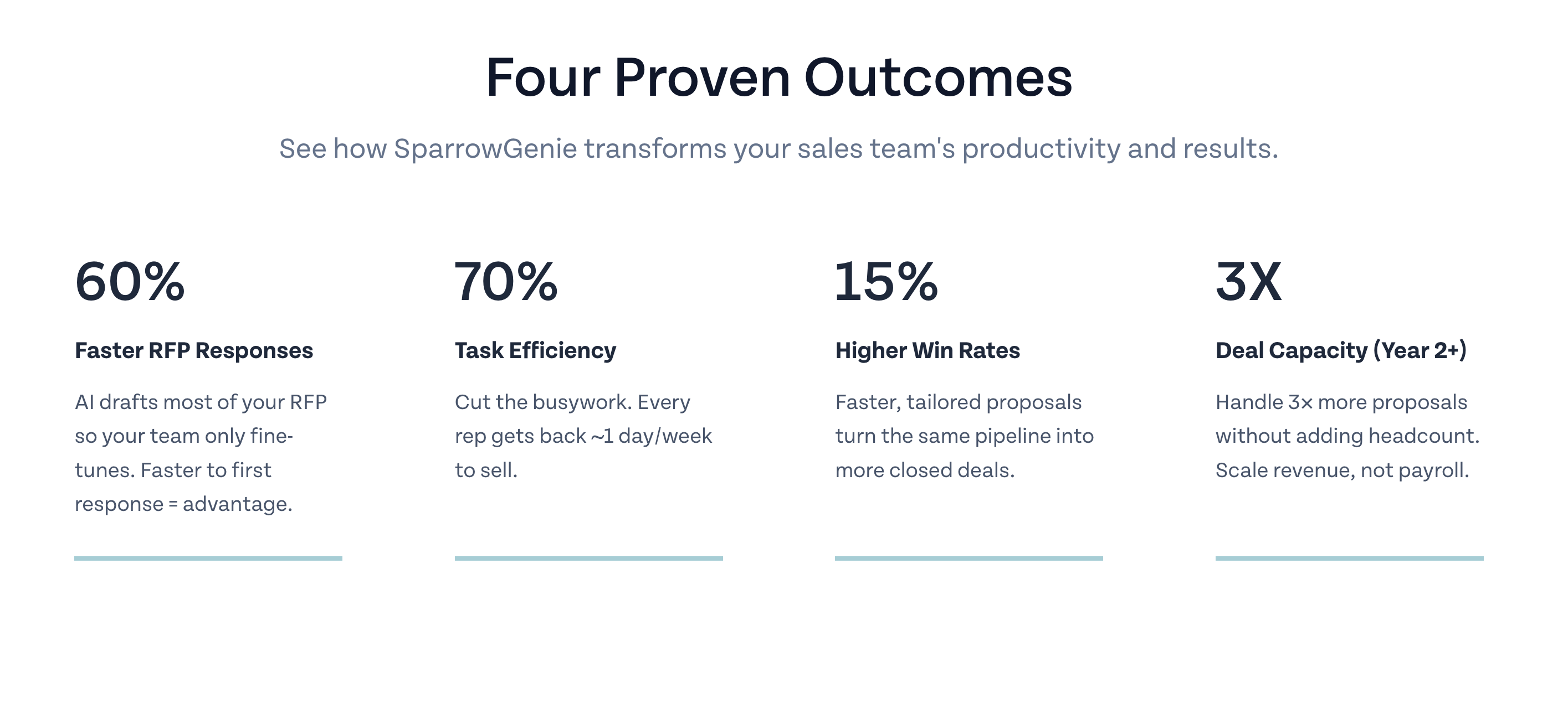 This clarity directly supports higher win rates by improving trust with buying committees and reducing internal errors, which is why platforms like SparrowGenie consistently help teams unlock measurable win-rate lifts without changing how many RFPs they respond to.