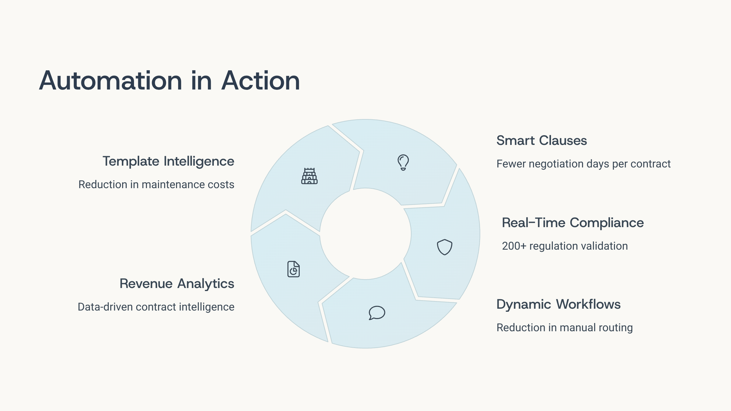 When most people hear “contract automation,” they think of faster signatures or fewer redlines. But in reality, it’s a complete reimagining of how contracts move through an enterprise. Instead of being bottlenecks, contracts become living systems—constantly learning, adapting, and accelerating revenue. Here’s what it looks like in practice: