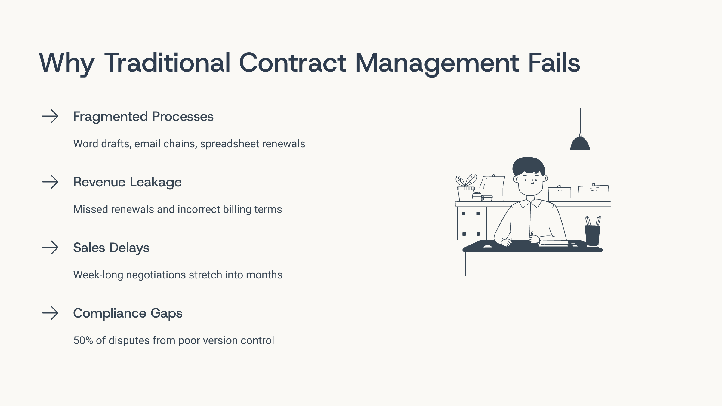 At scale, this patchwork approach creates issues that directly undercut growth. Here are a few of the reasons why traditional contract management fails enterprises: