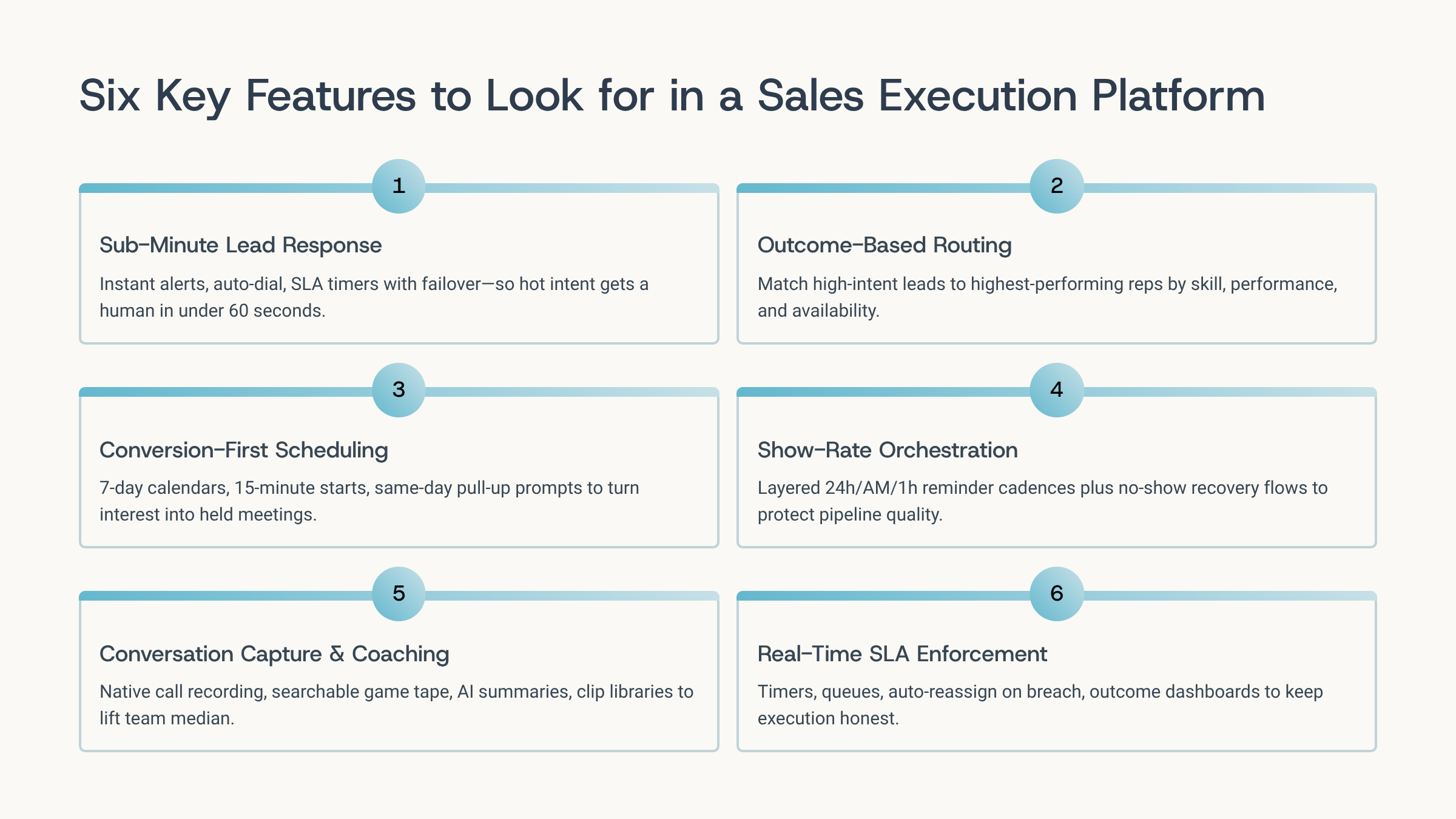 When you’re choosing a sales execution platform, ignore the shiny extras and zero in on the features that force revenue-moving behavior: faster first touches, fuller calendars, higher show rates, smarter routing, and better coaching. Here are the six that matter most.