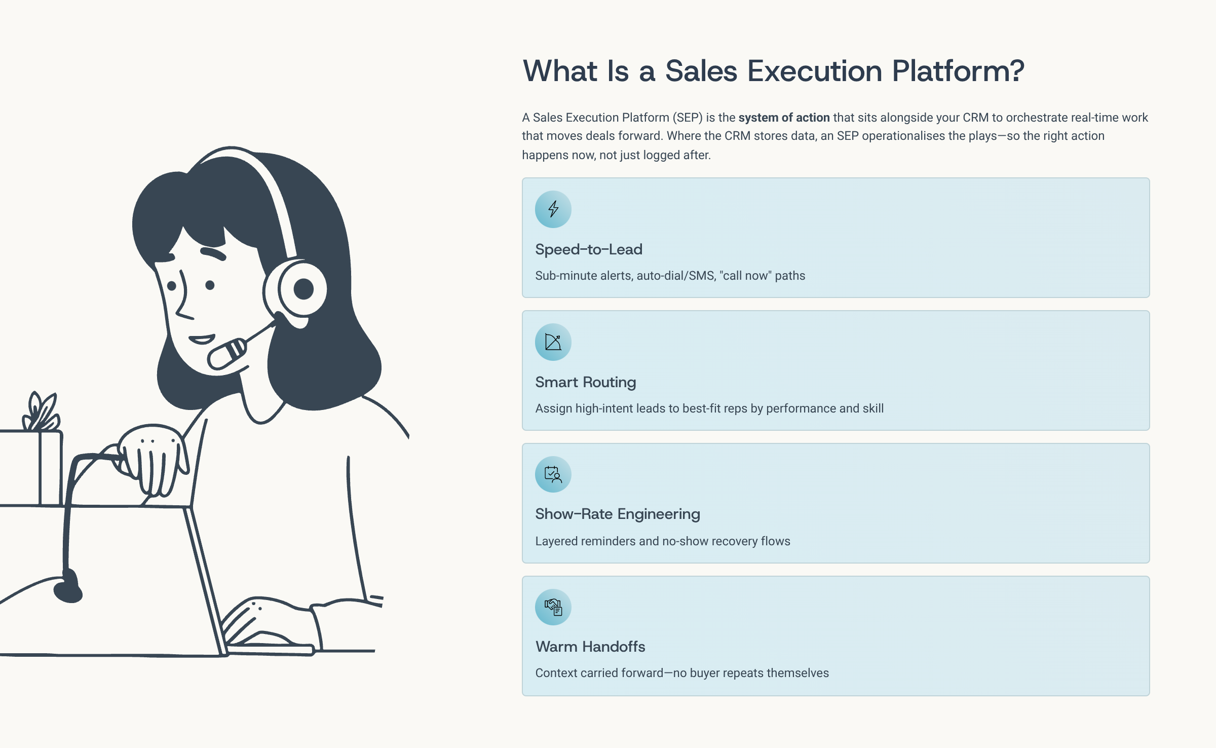 Modern buyers move in minutes, not weeks. Without a Sales Execution Platform (SEP) to enforce fast response, smart routing, show-rate mechanics, and continuous coaching, you leak revenue your CRM can’t plug.