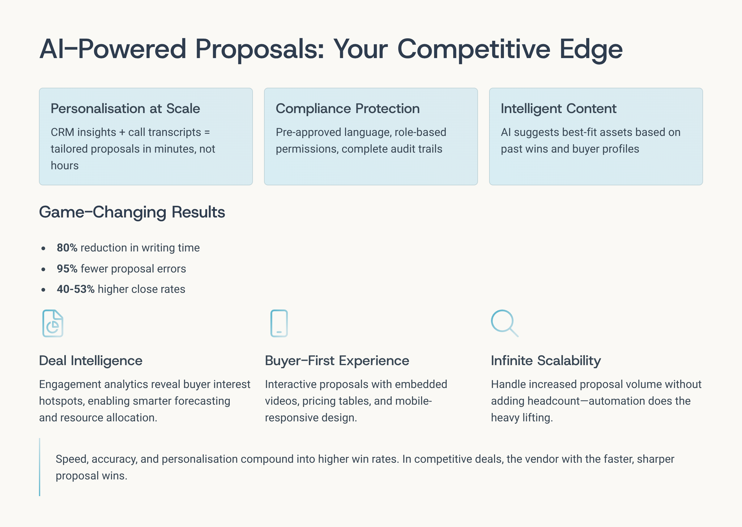 Speed, accuracy, and personalization all compound into higher win rates. Buyers trust consistent, error-free proposals that arrive while interest is high. Companies report 40–53% higher close rates with proposal automation in place. In competitive deals, the vendor with the faster, sharper proposal often wins.