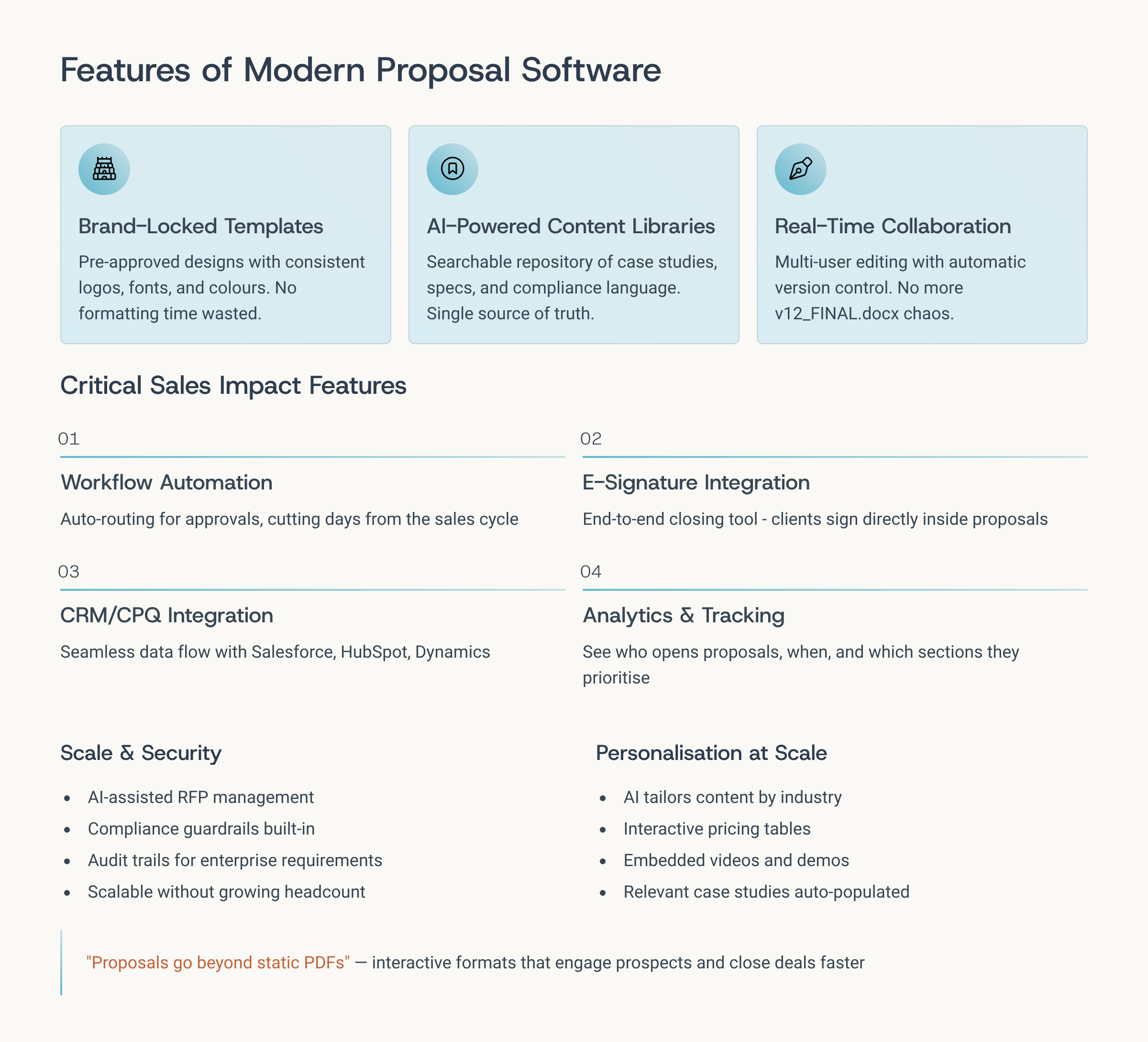 Modern proposal software isn’t just a document builder. It’s a full-fledged sales acceleration engine designed to streamline creation, maintain consistency, ensure compliance, and give sales teams visibility into buyer behavior. From your research files, here are the features that matter most—and why they matter.