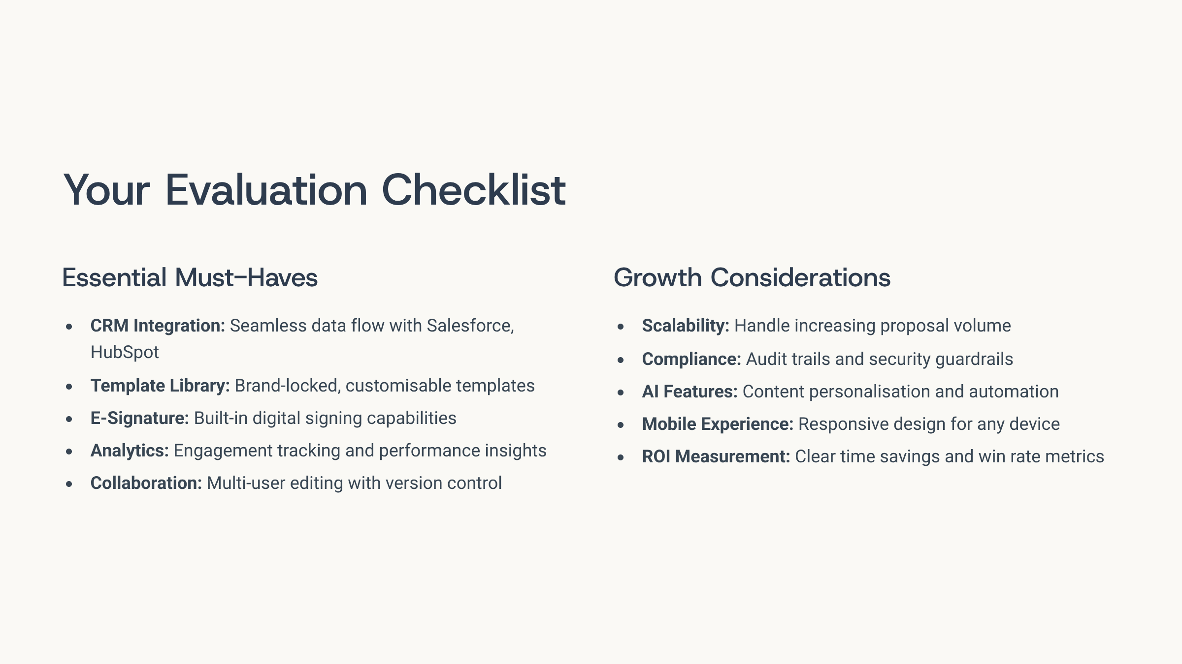 Choosing proposal software isn’t about picking the tool with the longest feature list. It’s about finding the platform that fits your team’s workflow, deal complexity, and growth goals. Here are the dimensions you should consider before making the call: