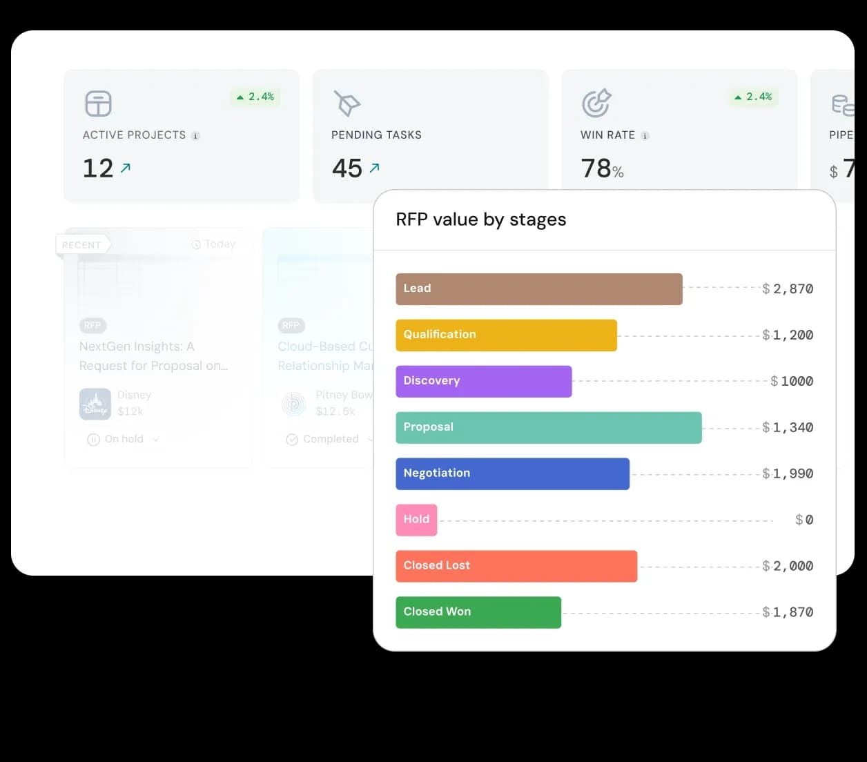 Track active pipeline value of projects, win rates, and ROI across sales, pre-sales, and legal—all in one secure, data-driven dashboard for true revenue alignment.